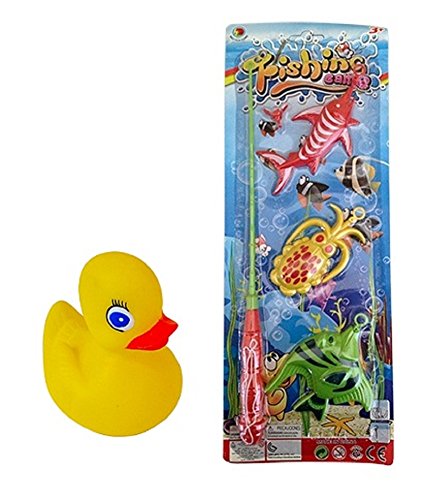 Fun Kids Magnetic Fishing Toy Game Bundle with Rubber Ducky-Two Items: One Magnetic Fishing Pole with Magnetic Fish, One Water Squirting Rubber Duckie