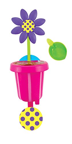 Water & watch me grow! Helps teach baby cause and effect by pouring water over the flower pot, causing flower to rise upward, and the wheel beneath to spin as water flows out the bottom. Use the leaf scooper to help baby develop hand-eye coordination by pouring and scooping water from the tub. Spin flower top around with the touch of a finger. Includes suction cup for attachment to tub wall.