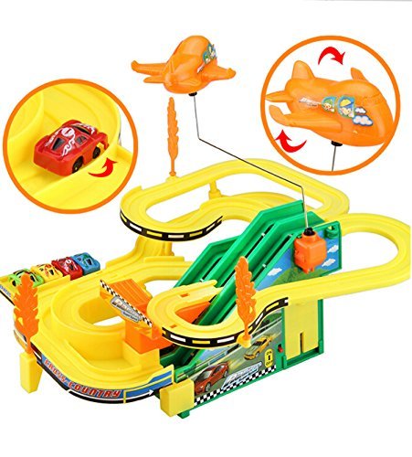 13 Pieces include: 3* race tracks; 4* race cars; 1* main body; 3* trees; 1* airplane; 1* Z shape axis; 1*sticker