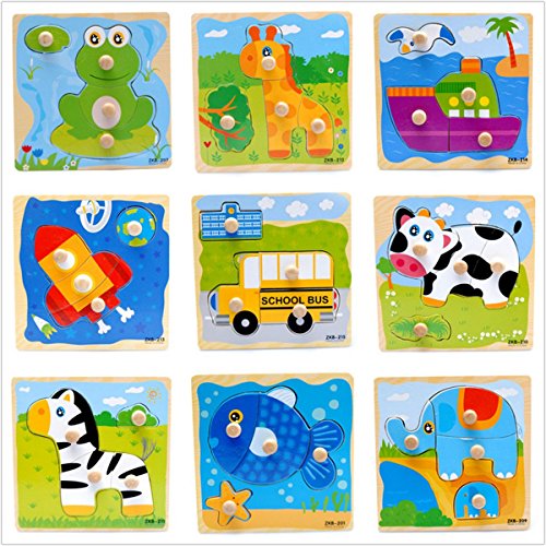 animals, transportation, daily necessities, etc Child cognitive animal wooden puzzle toys Colorful, each tile has a wooden handle pinch, it is convenient when baby take it Different tile inlay back at the corresponding location shown, children can learn to recognize different animals, compare irregular shape, training observation